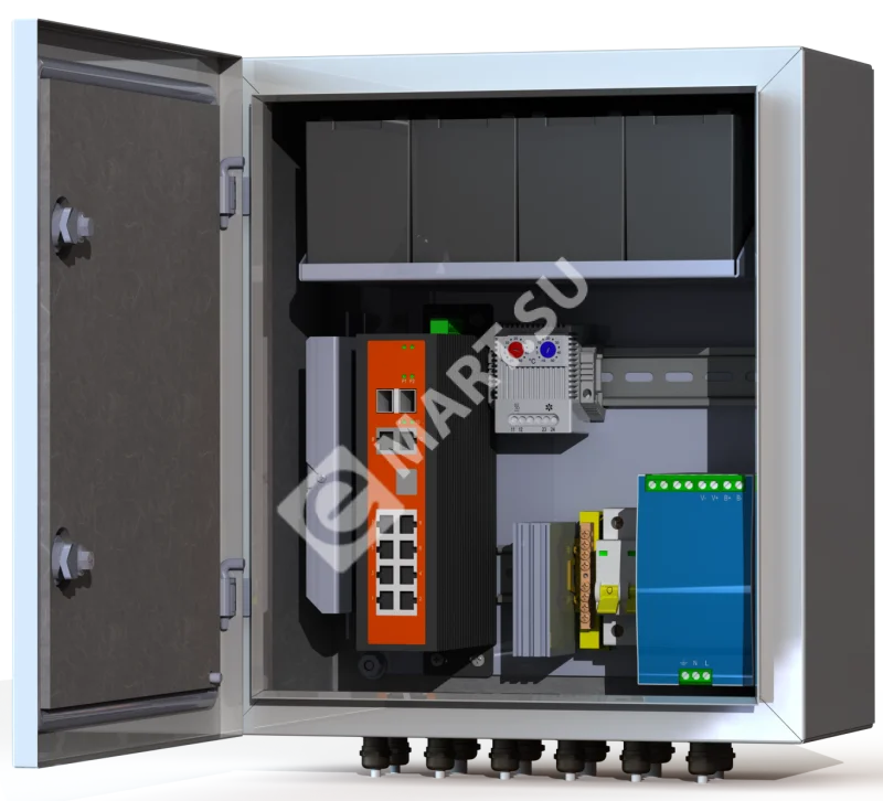 Двухполюсный защитный автомат 6А - 1 шт.Обогреватель 50Вт - 1 шт. Сдвоенный термостат - 1 шт. Блок бесперебойного питания 300Вт -1 шт. Аккумулятор 12В, 7А/ч - 4 шт. Промышленный неуправляемый коммутатор 8*PoE 802.3 af/at (бюджет 240 Вт), 2*combo SFP - 1 шт. Оптический кросс 4 порта SC/SM - 1 шт. Устройство грозозащиты линии 220В -1 шт. Устройство грозозащиты линий PoE -2 шт. Гермовводы 8*PG9, 4*PG13,5 -1 комплект.