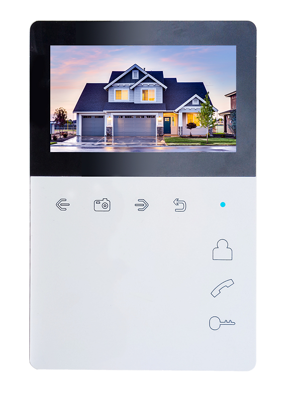 Монитор цветного видеодомофона, экран 4,3 дюйма, сенсорные кнопки, встроенный блок питания, возможность записи фото и видео на SD карту. TFT LCD 4,3" 480x272, PAL/NTSC, Hands-Free, 2 панели, 2 камеры, до 4-х шт. в параллель, запись фото и видео на microSD до 32ГБ или фото во внутреннюю память не менее 64 кадров. Питание 220В. Габариты 118х180х27мм
