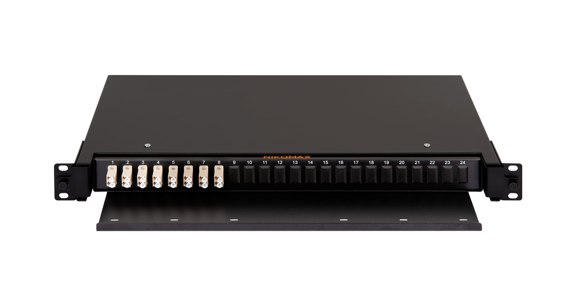 Оптический кросс NIKOMAX 19" Premium Line, 1U, укомплектованный на 16 портов LC/UPC (8 двойных LC/UPC адаптеров), MM 50/125 OM2, выдвижной, с полкой, черный, в комплекте: адаптеры, монтажные шнуры 1м, сплайс-кассета с крышкой, гильзы, заглушки