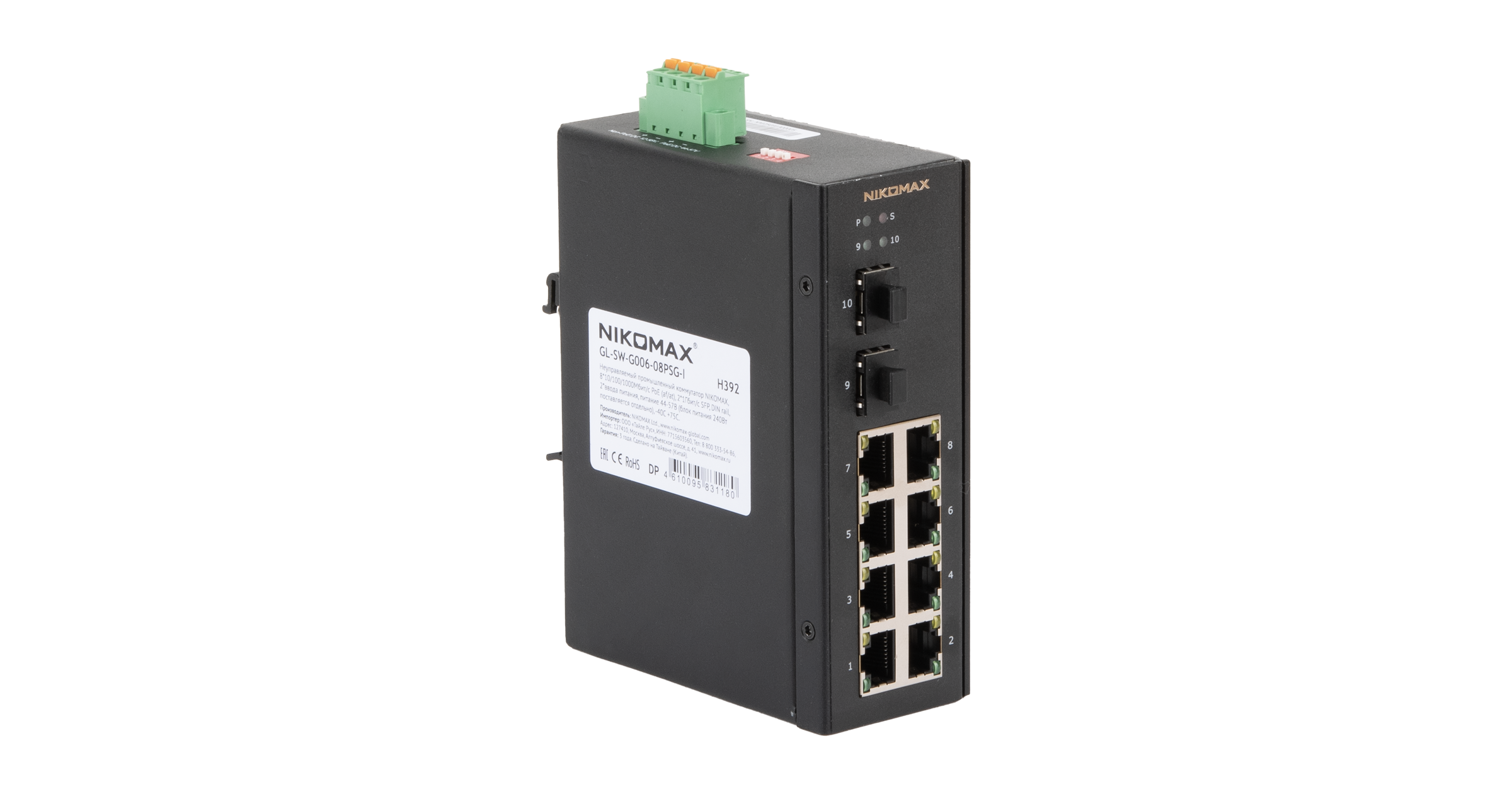 Неуправляемый промышленный коммутатор NIKOMAX, 8*10/100/1000Мбит/с PoE (af/at), 2*1Гбит/с SFP, крепление на DIN-рейку, 2*ввода питания, питание 44-57В (блок питания 240Вт поставляется отдельно), -40С +75С.
