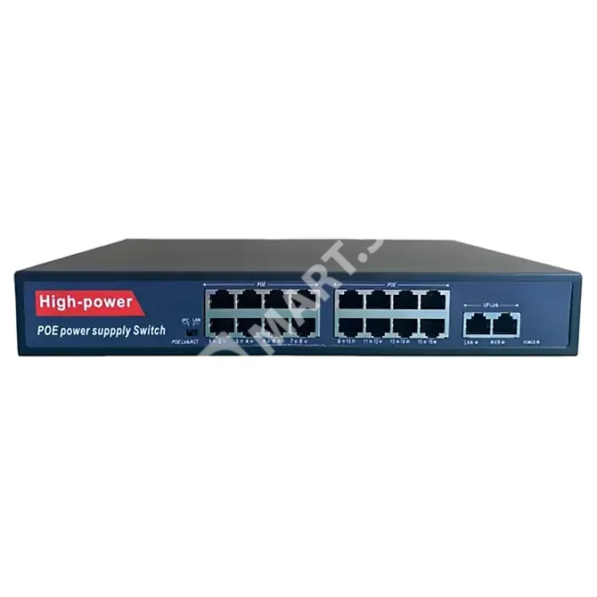 HN-POE216 – неуправляемый коммутатор на 18 портов, 16 из которых с поддержкой технологии POE стандарта 802.3af/at (Type A) 100 Мбит. Максимально поддерживаемая мощность подключаемых устройств составляет 30 Вт на каждый порт. Максимальная суммарная мощность всех подключенных устройств должна быть не больше чем 350 Вт. Дополнительно присутствуют 2 LAN порта с максимальной скоростью до 1000 Мбит. Дальность подключения устройств (POE+данные) составляет до 250 метров в режиме IPC (поток не более 10 мБит/с на 1 порт) или до 100 метров в обычном режиме.