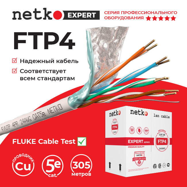 Netko Кабель F/UTP4 (FTP4 ) cat.5e, 4 пары 24 AWG BC, одножильный, экранированный